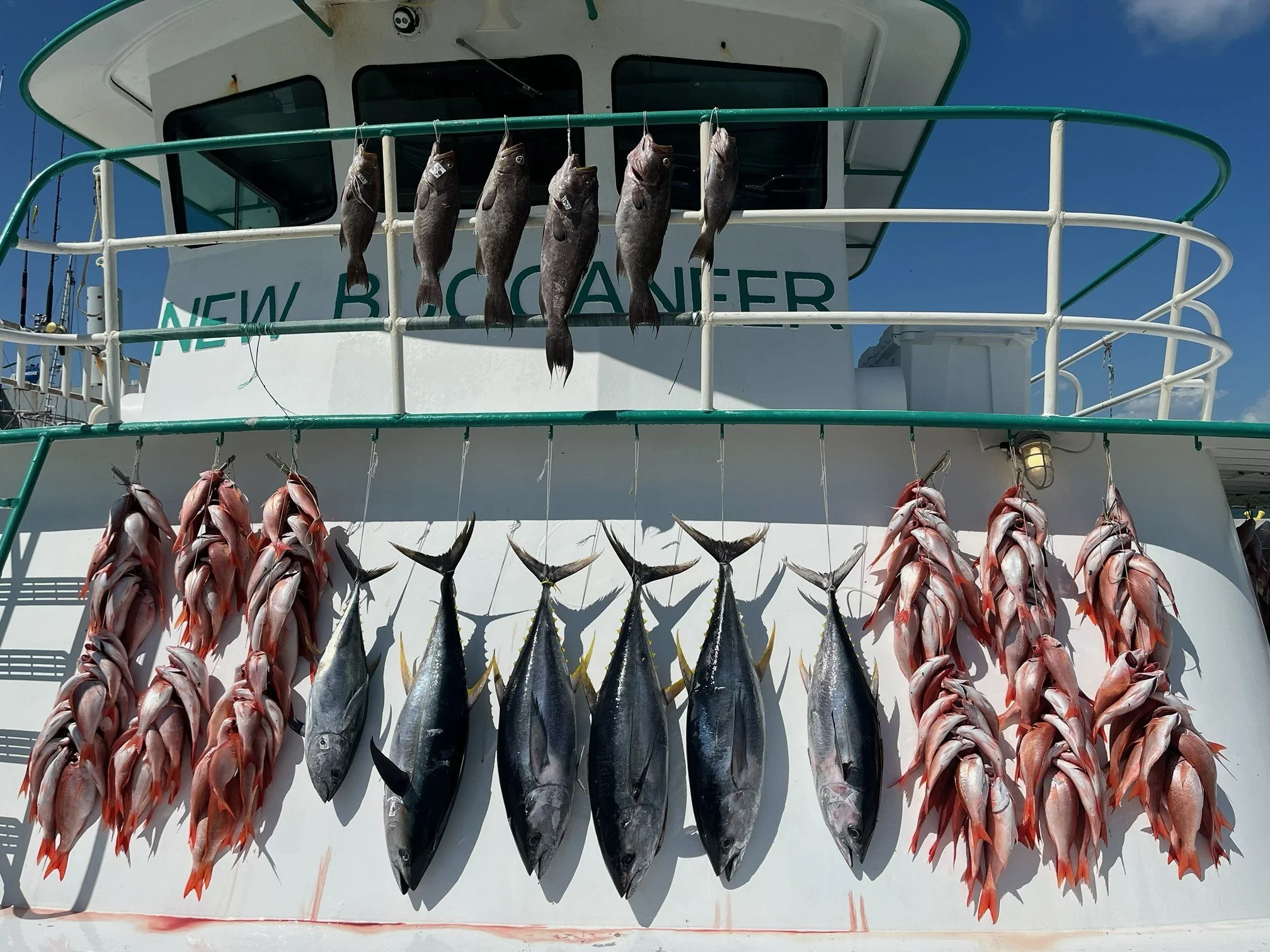 Same as 8-hour and 12-hour with chance for exotic species such as * Black & Yellowfin Tuna, *Barrelfish, *Tilefish, *Wahoo, *Queen Snapper, etc. King Mackerel, Ling, Amberjack and Grouper are also more likely during cold weather months than on the 12-hour trip. Tuna are usually caught on diamond jigs, plugs, and topwater lures (not provided). This trip is eligible for 2-day limits on species allowed by federal regulations.
